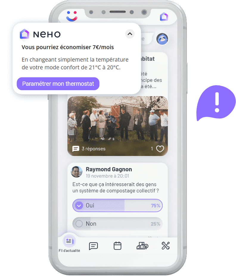 De plus, NeHo est la seule solution dont l'ergonomie exploite des biais cognitifs à des fins vertueuses (Light Patterns), par la mise à disposition de fonctionnalités utilitaires et de confort (domotique, thermostat, réseau social...) au même endroit que le suivi des consommations pour renouveler et pérenniser l'intérêt de la solution auprès de vos occupants.