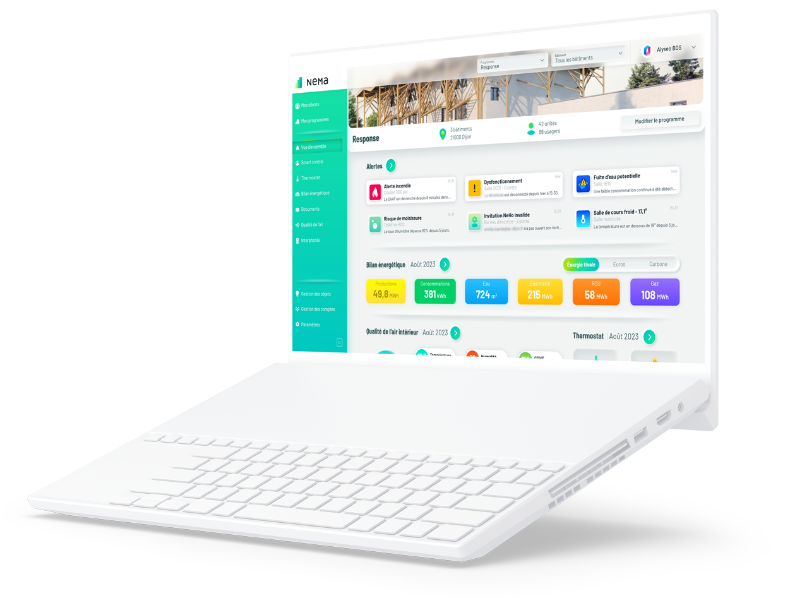 NeMa est une suite applicative pour Smart Building à destination des exploitants de bâtiments. Bien plus qu'une simple plateforme de services, c'est un portail d'hypervision vous permettant d'analyser efficacement les données de vos structures, identifier les opportunités d'économies d'énergie, piloter et automatiser vos équipements, et programmer des alertes pour une réactivité accrue, sans effort.