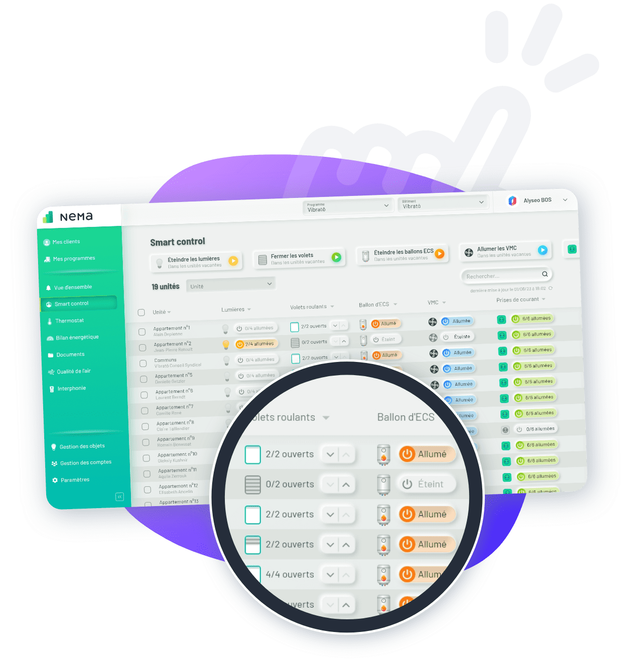 Avec NeMa, vous pouvez visualiser et piloter tous vos équipements au même endroit, qu'il s'agisse de la chaudière, la centrale de traitement d'air, les capteurs, les compteurs énergétiques ou les équipements réseaux de votre bâtiment.